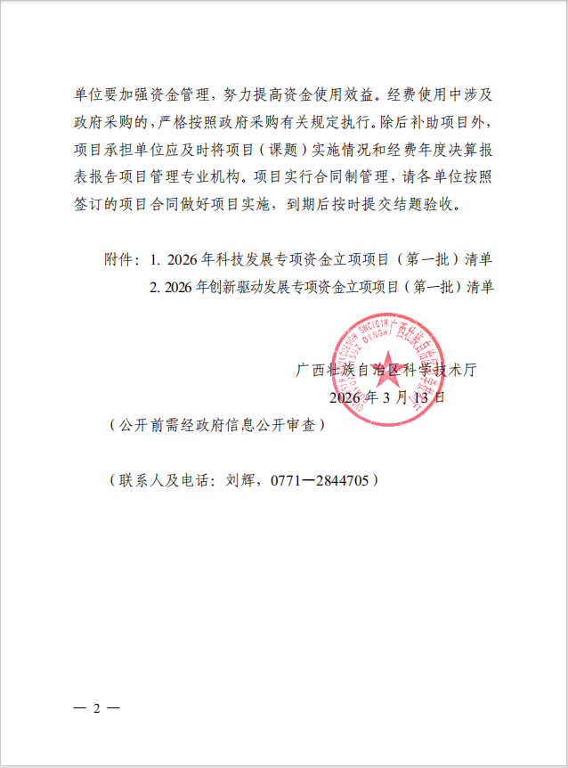近日,自治区科技厅公布了集中申报的2026年度广西科技计划项目立项结果,根据《自治区科技厅关于下达2026年自治区科技发展专项资金和创新驱动发展专项资金立项项目(第一批)经费的通知》(桂科发〔2026〕64号),我校在项目立项数量、资助经费及项目类型覆盖面等方面均取得历史性突破,展现了学校科研实力持续攀升的良好态势。