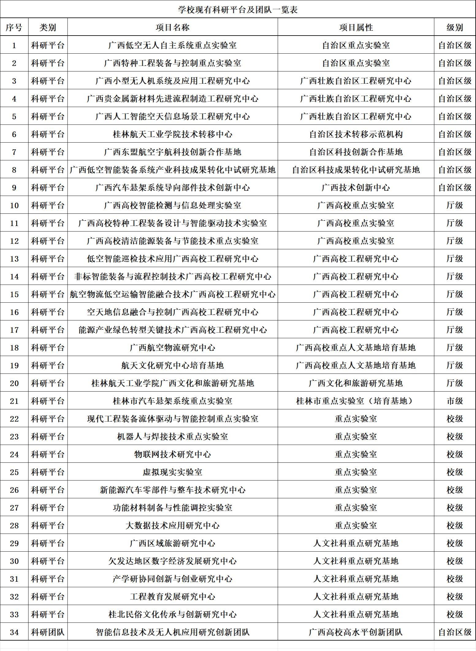 学校现有2个广西重点实验室,3个自治区级工程研究中心,1个自治区级中试研究基地,1个自治区级技术创新中心,1个自治区科技创新合作基地,3个广西高校重点实验室、5个广西高校工程研究中心、2个广西高校人文社科重点研究培育基地,1个广西文化和旅游研究基地,1个桂林市重点实验室,12个校级科研平台,1个广西高校高水平创新团队(智能信息技术及无人机应用研究创新团队),获批为自治区技术转移示范机构。